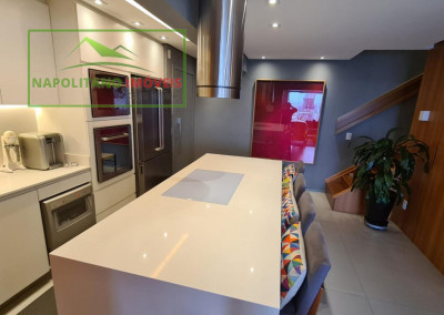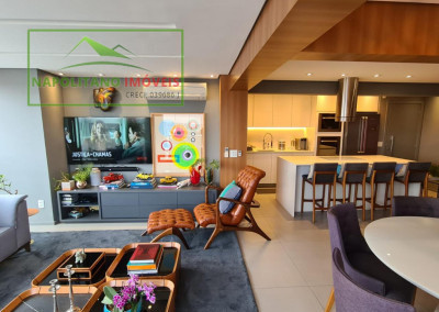 No piso inferior, você encontra uma sala integrada à varanda e à cozinha com ilha, um espaço sofisticado e acolhedor, perfeito para receber amigos e familiares. O andar conta ainda com lavabo e área de serviço funcional.